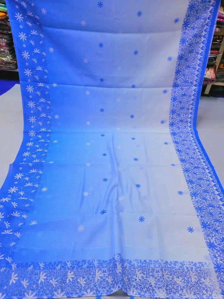 - সফট ব্লু ও হোয়াইট গ্রেডিয়েন্ট বেইজে চোখ জুড়ানো ডিজিটাল ফুল প্রিন্টের কাজ।